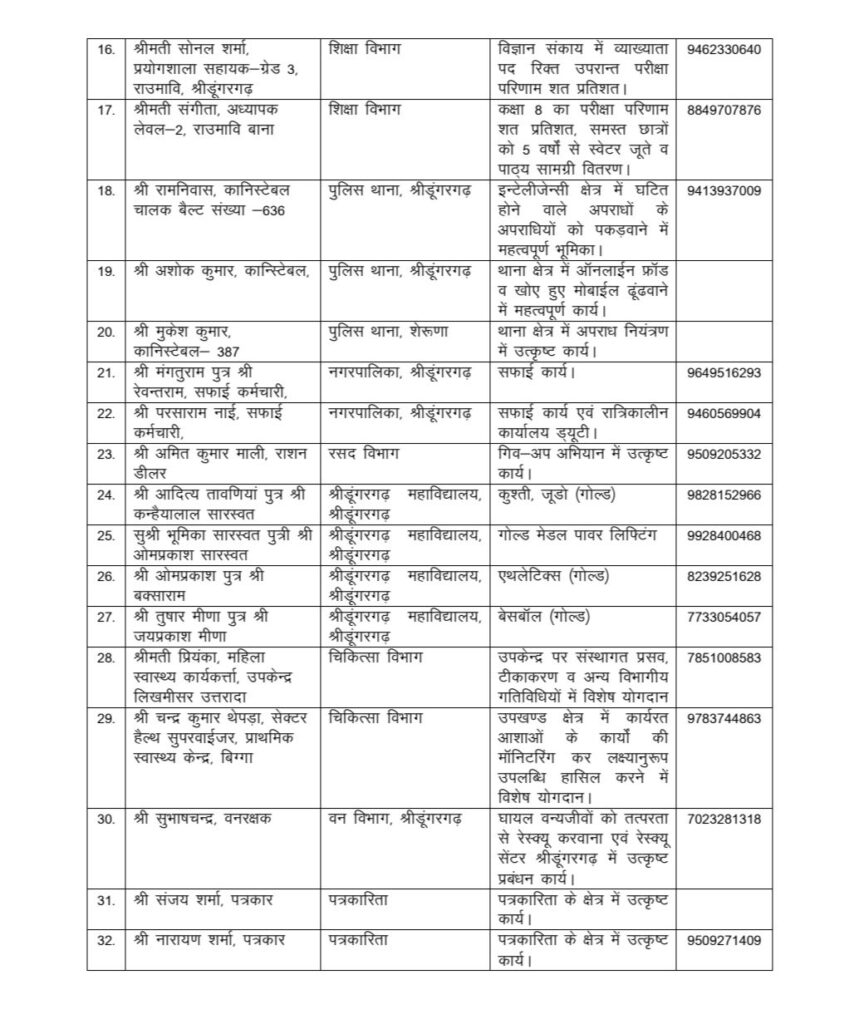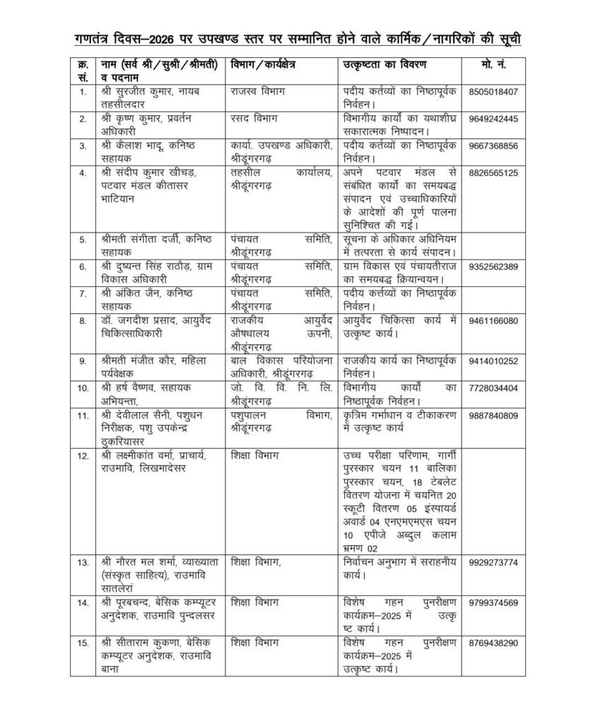 NEXT 25 जनवरी, 2026 श्रीडूंगरगढ़। श्रीडूंगरगढ़ उपखण्ड स्तर पर इस वर्ष गणतंत्र दिवस समारोह के दौरान 32 विशिष्ट व्यक्तित्वों को सम्मानित किया जाएगा। उपखण्ड कार्यालय की ओर से इसकी सूची जारी कर दी गई है। सूची में विभिन्न विभागों के कार्मिकों, उत्कृष्ट प्रदर्शन करने वाले खिलाड़ियों, पुलिस जवानों के साथ-साथ क्षेत्र के पत्रकारों को भी शामिल किया गया है।