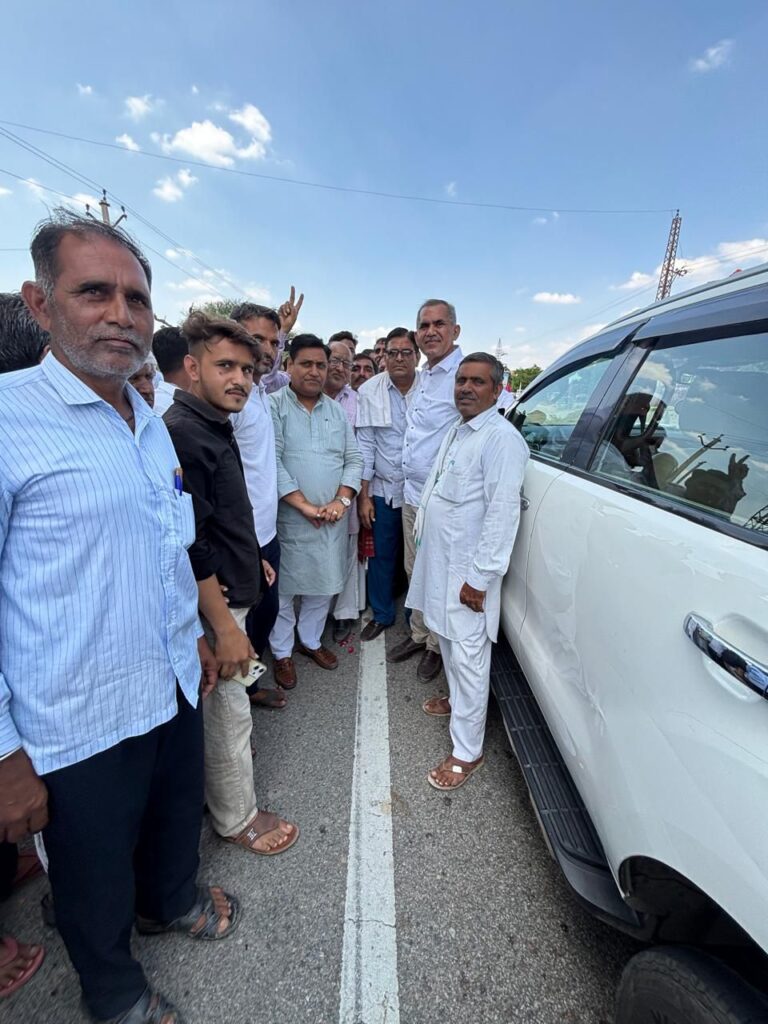 गणपति धर्म कांटे पर पूर्व विधायक मंगलाराम गोदारा के नेतृत्व में भव्य स्वागत समारोह आयोजित हुआ, जहां सैकड़ों कार्यकर्ता हाथों में झंडे-बैनर लिए नारे लगाते नजर आए।