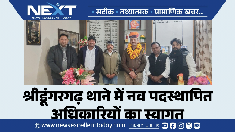 NEXT 8 जनवरी, 2026 श्रीडूंगरगढ़। श्रीडूंगरगढ़ नायक समाज ने नव पदस्थापित थाने के थानाधिकारी कश्यप सिंह और सब-इंस्पेक्टर रतनलाल का भव्य स्वागत किया। समाज ...