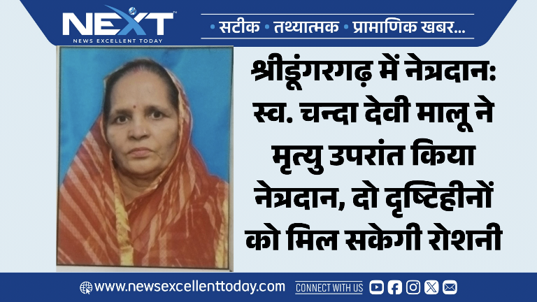 NEXT 9 जनवरी, 2026 श्रीडूंगरगढ़। समाजसेवा और मानवता की दिशा में एक प्रेरणादायक उदाहरण सामने आया है। आडसर बास निवासी स्वर्गीय चन्दा देवी मालू ...