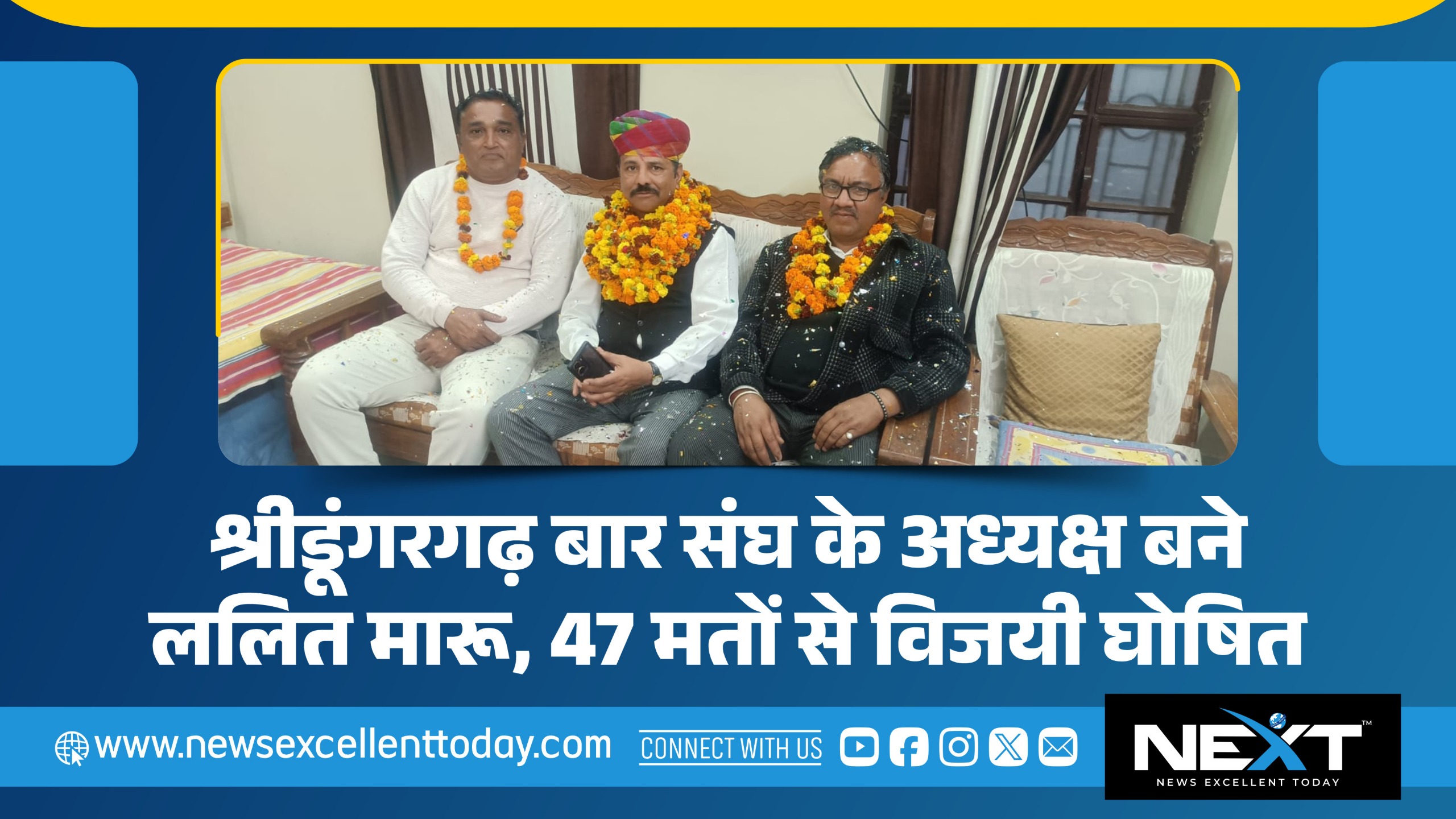 NEXT 12 दिसम्बर, 2025 श्रीडूंगरगढ़। श्रीडूंगरगढ़ बार संघ में अध्यक्ष पद के लिए एडवोकेट ललित मारू 47 वोट से विजयी हुए। कुल 109 वोट ...
