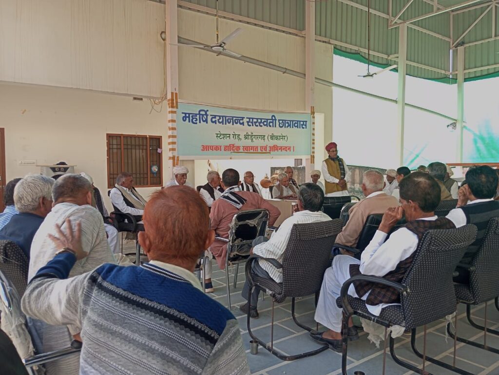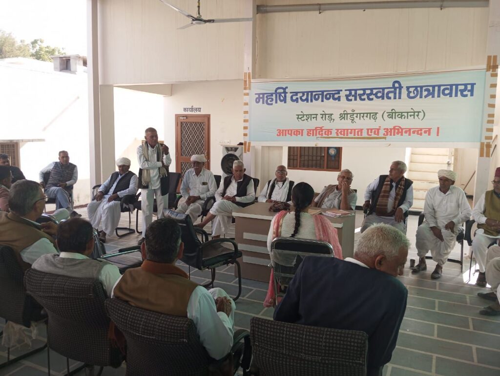 NEXT 7 दिसम्बर, 2025 श्रीडूंगरगढ़। महर्षि दयानंद सरस्वती छात्रावास विकास समिति की बैठक रविवार को छात्रावास परिसर में आयोजित हुई। बैठक की अध्यक्षता एडवोकेट श्यामसुन्दर आर्य ने की। मंत्री सुशील सेरडिया ने भवन निर्माण कार्य की प्रगति रिपोर्ट और बैठक का एजेंडा प्रस्तुत किया, जिस पर सदस्यों ने विस्तार से चर्चा की।