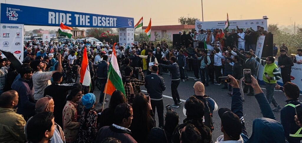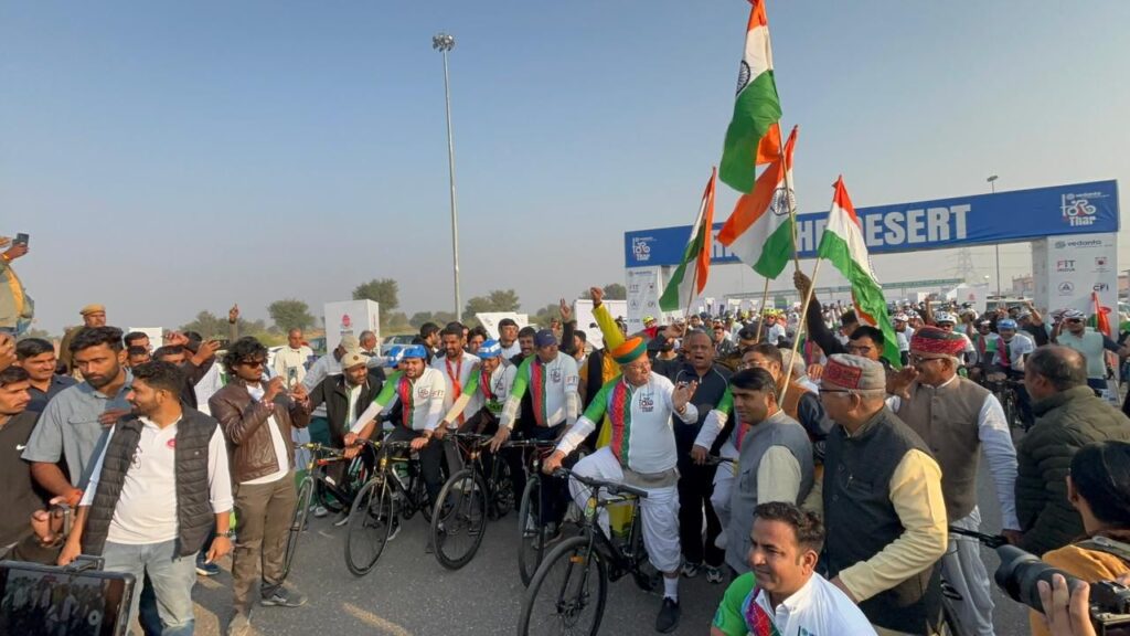 NEXT 23 नवम्बर, 2025 श्रीडूंगरगढ़। देश में पहली बार राजस्थान के बीकानेर में 200 किलोमीटर लंबी अंतरराष्ट्रीय साइक्लिंग रेस का आयोजन हुआ। रविवार सुबह 8:15 बजे नौरंगदेसर में केंद्रीय कानून मंत्री अर्जुन राम मेघवाल ने ‘वेदांता टूर डी थार’ को हरी झंडी दिखाकर रवाना किया। यह आयोजन प्रधानमंत्री नरेंद्र मोदी के सांसद खेल महोत्सव-2025 के तहत हुआ।