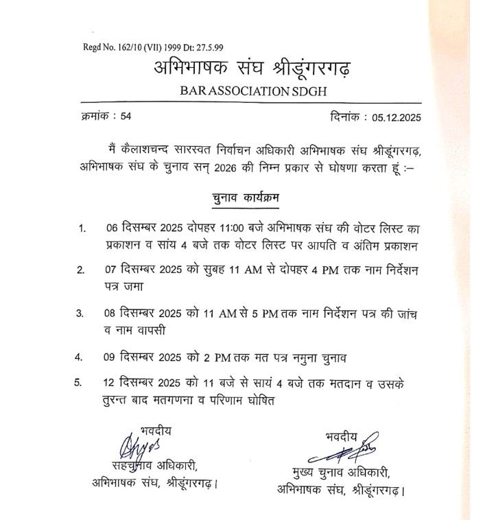 घोषणा के साथ ही बार क्षेत्र में आचार संहिता लागू हो गई है। अब बार चुनाव 2025 के लिए 12 दिसंबर को होने वाले मतदान का विस्तृत कार्यक्रम निर्वाचन अधिकारी जल्द जारी करेंगे।