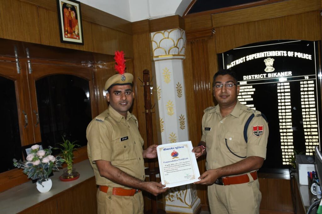 बीकानेर जिला पुलिस अधीक्षक कावेंद्र सिंह सागर ने पुनीत कुमार को प्रशस्ति पत्र देकर सम्मानित किया। एसपी सागर ने कहा कि पुनीत ने अपने कार्य के प्रति जो मेहनत, लगन और समर्पण दिखाया है, वह पूरे पुलिस बल के लिए प्रेरणादायक है। उन्होंने उम्मीद जताई कि पुनीत भविष्य में भी इसी प्रतिबद्धता के साथ कार्य करते रहेंगे।