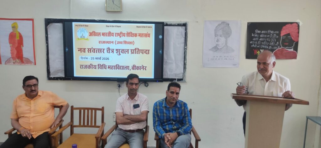 NEXT 25 मार्च, 2026 श्रीडूंगरगढ़। राजकीय विधि स्नातकोत्तर महाविद्यालय बीकानेर में बुधवार को हिंदू नव संवत्सर 2083 उत्साहपूर्वक मनाया गया। कार्यक्रम की अध्यक्षता महाविद्यालय के प्राचार्य प्रो. भगवाना राम बिश्नोई ने की। आयोजन अखिल भारतीय राष्ट्रीय शैक्षिक महासंघ (उच्च शिक्षा, राजस्थान) की स्थानीय इकाई द्वारा किया गया।