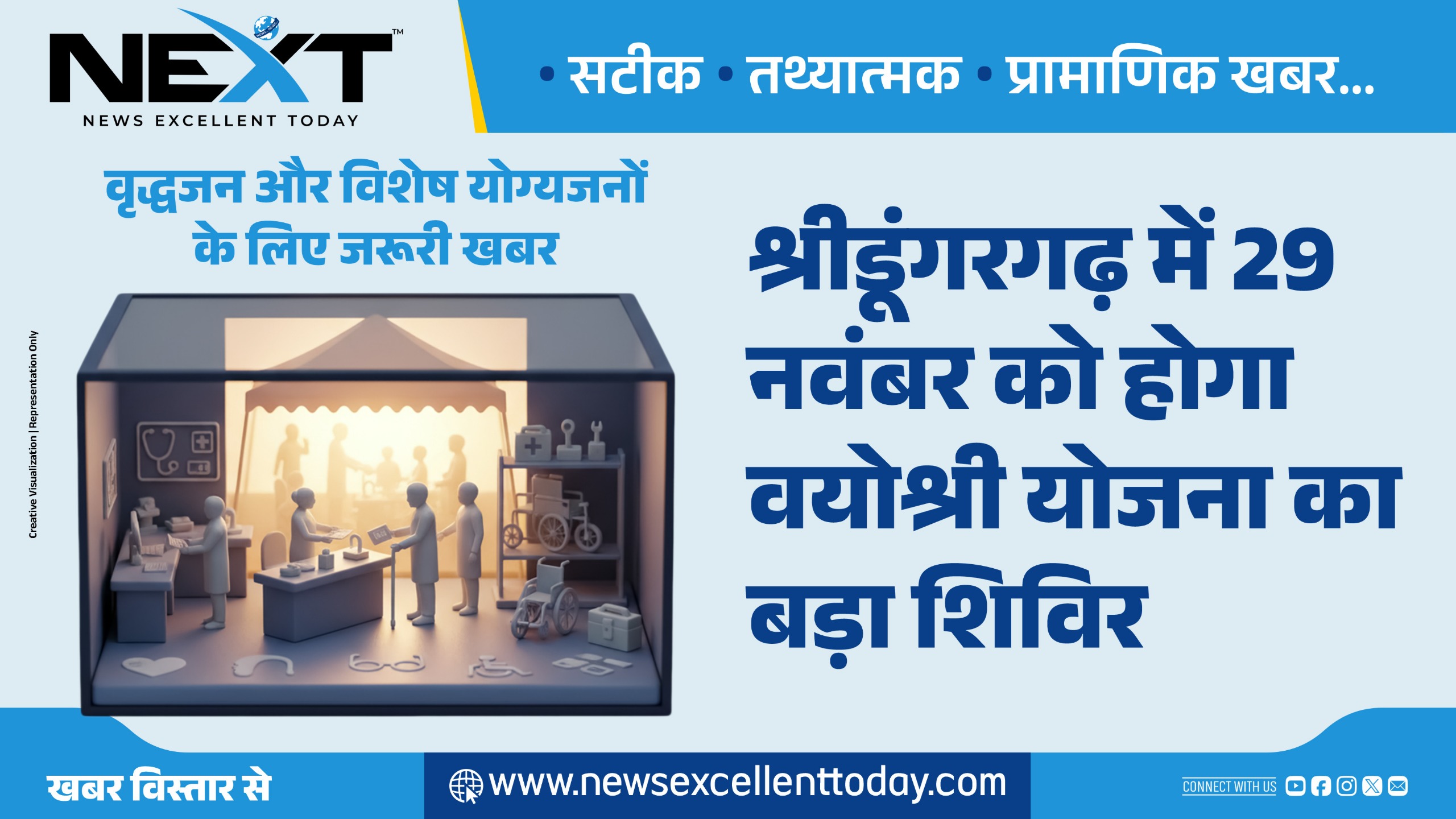 NEXT 18 नवम्बर, 2025 श्रीडूंगरगढ़। जिला कलक्टर बीकानेर के निर्देशों और ‘दिशा’ समिति की बैठक में केंद्रीय मंत्री अर्जुनराम मेघवाल द्वारा दिए गए दिशानिर्देशों के बाद राष्ट्रीय वयोश्री योजना के तहत बड़ा एसेसमेंट शिविर 29 नवंबर को आयोजित किया जाएगा।