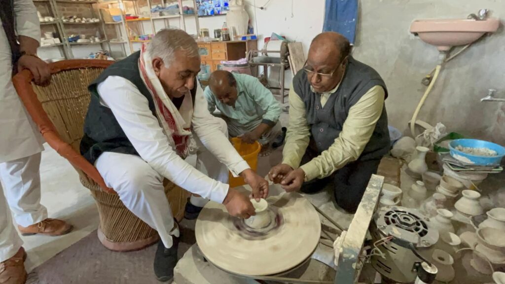 जयपुर में रामगोपाल सुथार ने ब्लू पॉटरी वर्कशॉप का किया निरीक्षण, खुद बनाया पॉट