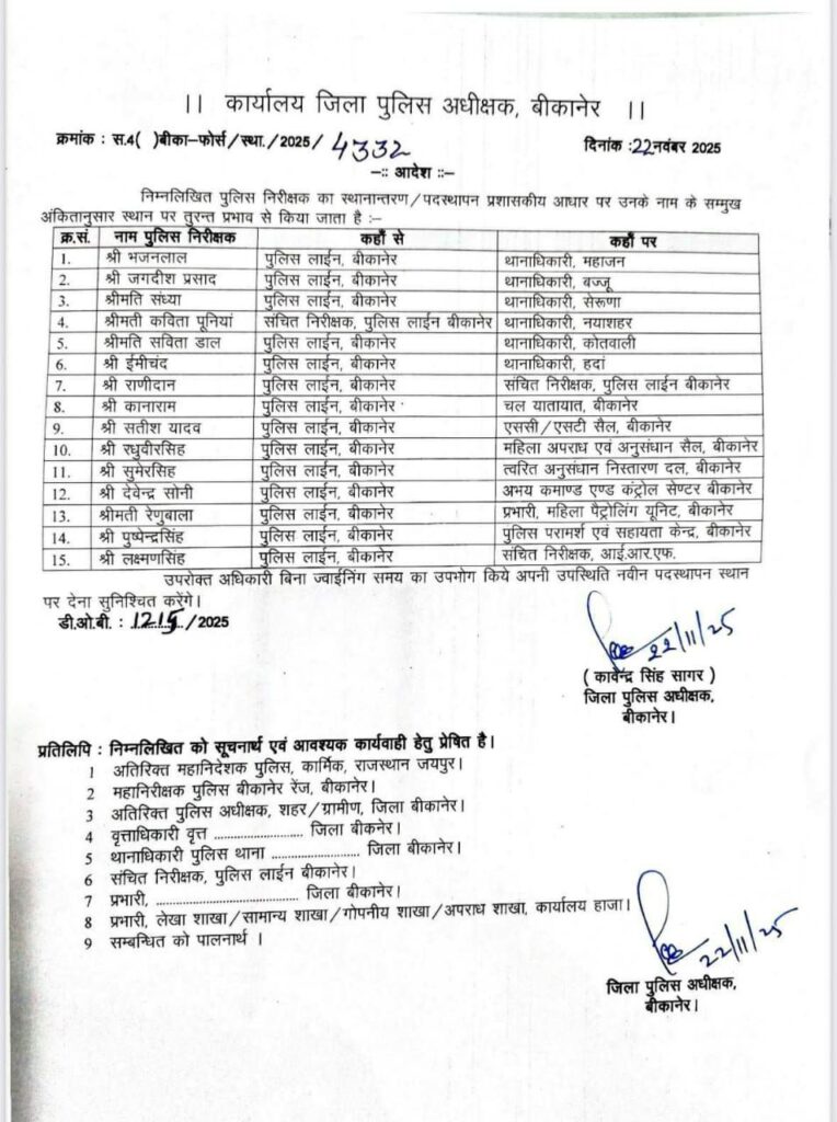 NEXT 23 नवम्बर, 2025 श्रीडूंगरगढ़।  जिले में पुलिस महकमे में प्रशासनिक फेरबदल किया गया है। एसपी कावेंद्र सिंह सागर ने शनिवार को पुलिस निरीक्षकों के तबादले आदेश जारी किए। आदेश के अनुसार, पुलिस लाइन में पदस्थापित 15 निरीक्षकों को विभिन्न थानों और यूनिट्स में पोस्टिंग दी गई है।