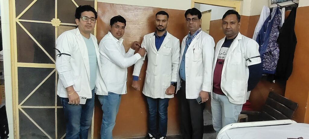 NEXT 26 दिसम्बर, 2025 श्रीडूंगरगढ़। राजस्थान नर्सेज एसोसिएशन एकीकृत के प्रदेश नेतृत्व के आह्वान पर शुक्रवार को सरदार पटेल मेडिकल कॉलेज एवं पीबीएम हॉस्पिटल बीकानेर के सभी विभागों में कार्यरत नर्सिंग कार्मिकों ने काली पट्टी बांधकर सांकेतिक विरोध प्रदर्शन किया। नर्सेज ने मेरिट एवं बोनस आधार पर नई नर्सिंग ऑफिसर भर्ती की मांग को लेकर राज्य सरकार का ध्यान आकर्षित किया।