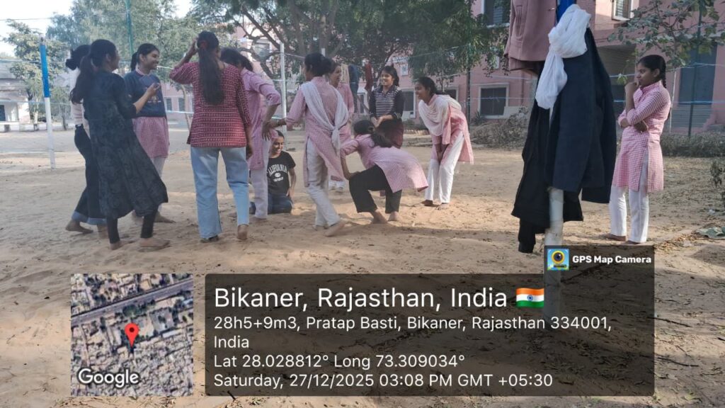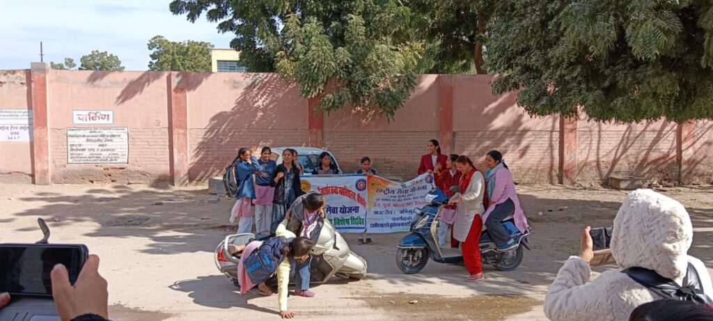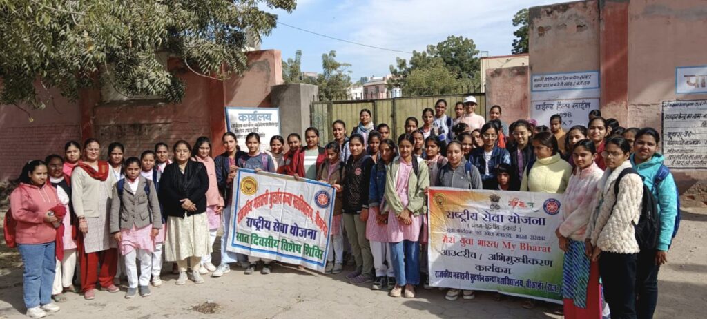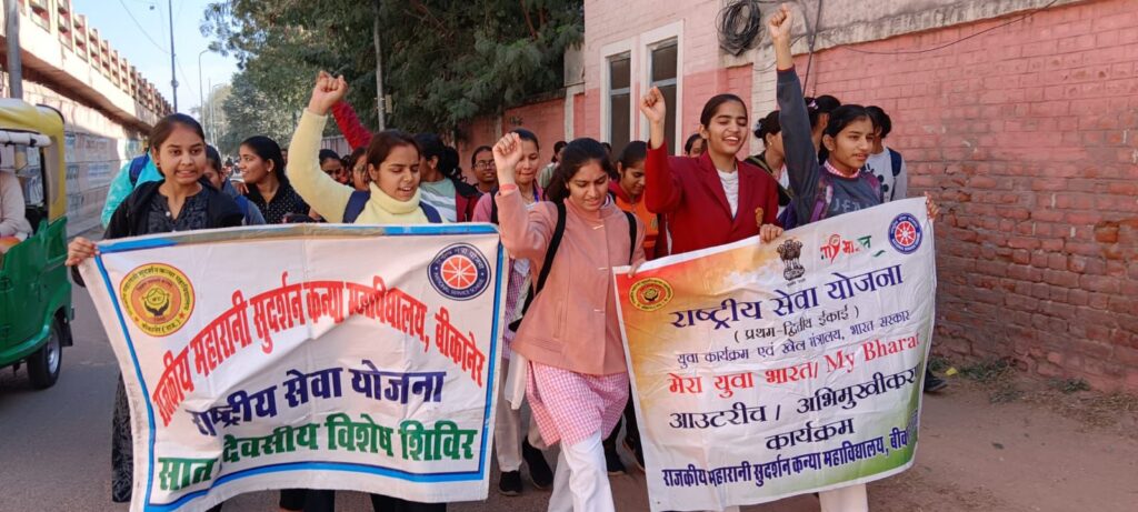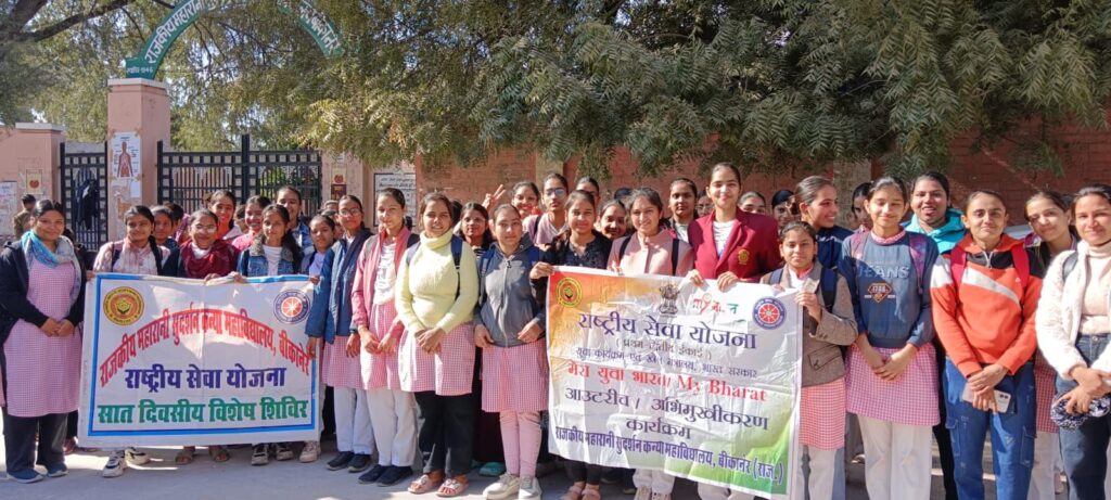 NEXT 28 दिसम्बर, 2025 श्रीडूंगरगढ़। राजकीय महारानी सुदर्शन कन्या महाविद्यालय की राष्ट्रीय सेवा योजना (एनएसएस) इकाई प्रथम एवं द्वितीय के संयुक्त तत्वावधान में आयोजित सात दिवसीय विशेष शिविर के षष्ठम दिवस पर शनिवार को विविध सामाजिक व जन-जागरूकता गतिविधियों का आयोजन किया गया। शिविर महाविद्यालय के प्राचार्य प्रो. नवदीप सिंह बैंस एवं वरिष्ठ संकाय सदस्य प्रो. मंजू मीणा के मार्गदर्शन में संपन्न हुआ।