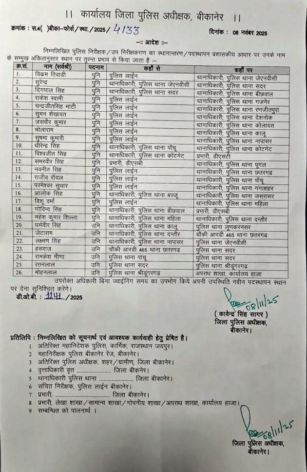 NEXT 8 नवम्बर, 2025 श्रीडूंगरगढ़। शहर और ग्रामीण इलाकों के थानों में एक बार फिर बड़ा फेरबदल किया गया है। पुलिस प्रशासन ने 26 पुलिस निरीक्षकों और 7 उप निरीक्षकों के तबादले करते हुए नई जिम्मेदारियां सौंपी हैं।