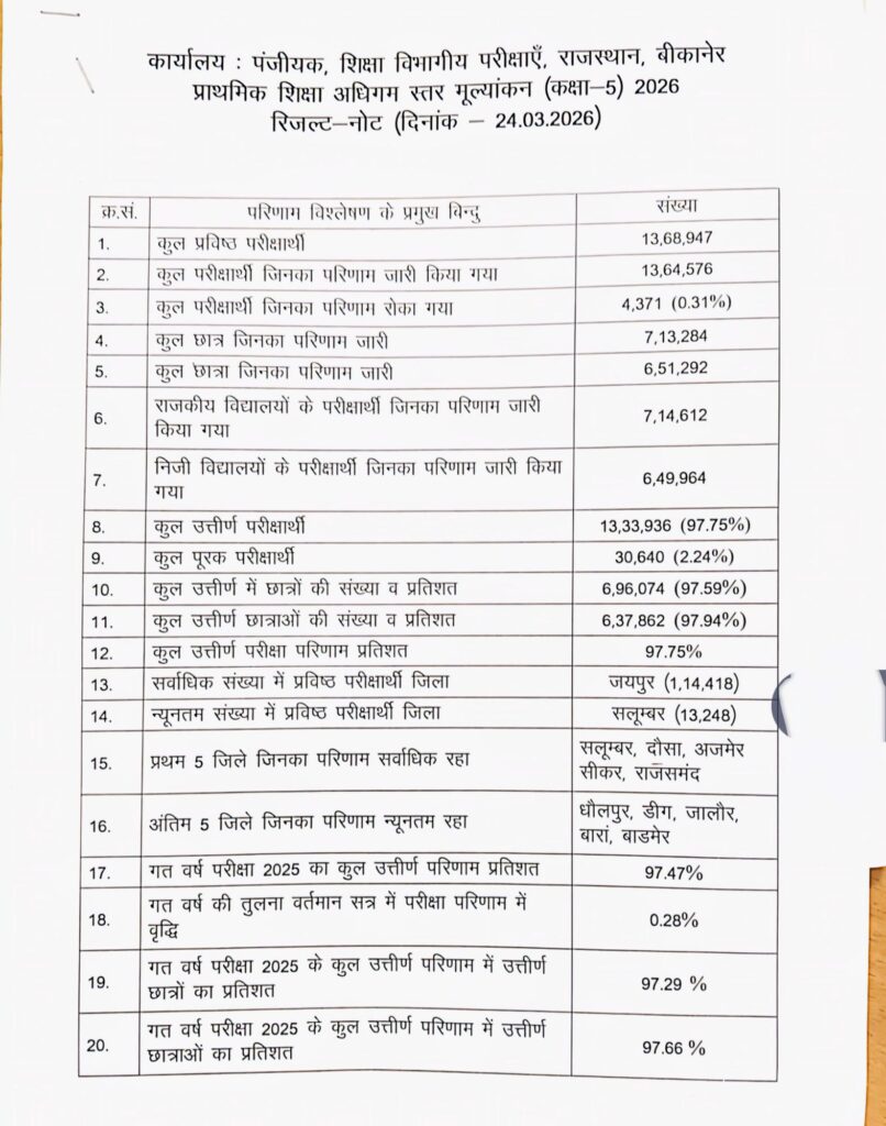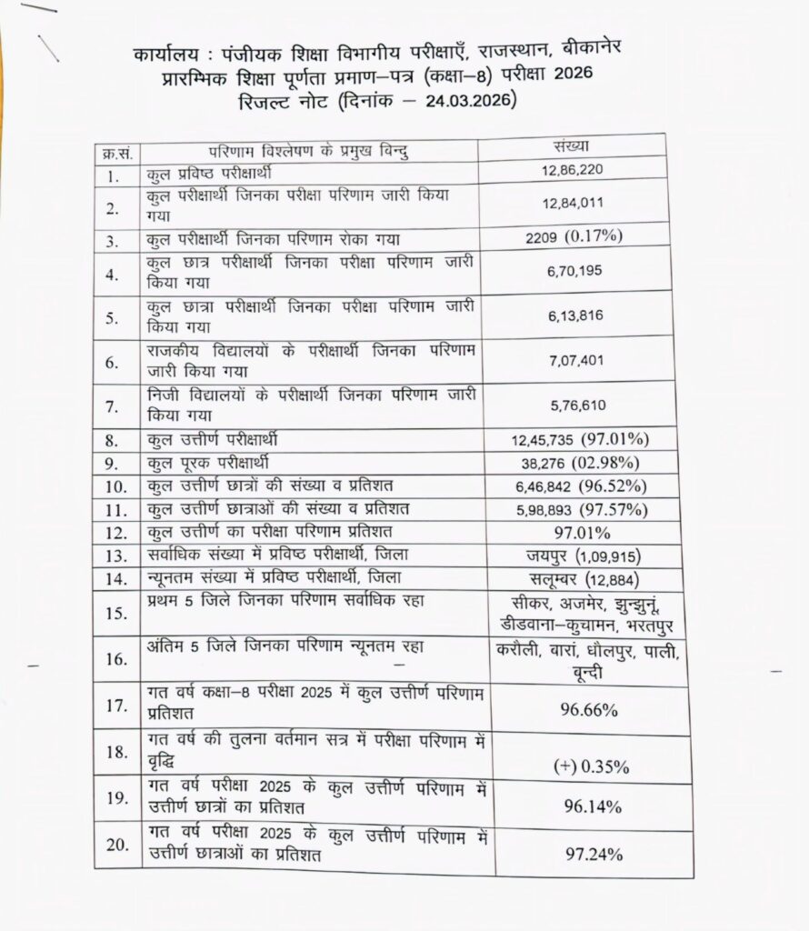 NEXT 24 मार्च, 2026 श्रीडूंगरगढ़। राजस्थान में प्राथमिक और उच्च प्राथमिक शिक्षा के स्तर का आकलन करने वाली कक्षा 5 और कक्षा 8 की परीक्षाओं का परिणाम मंगलवार दोपहर 1 बजे जारी कर दिया गया। शिक्षा मंत्री ने माध्यमिक शिक्षा बोर्ड, अजमेर कार्यालय से परिणाम घोषित किया। इस दौरान शिक्षा विभाग के वरिष्ठ अधिकारी भी मौजूद रहे।
