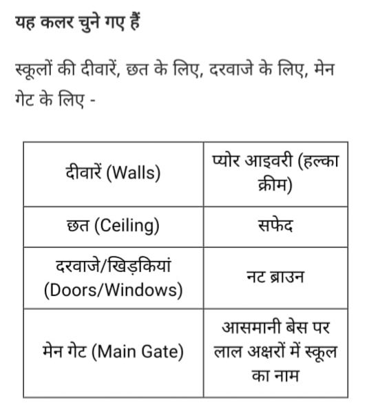 शिक्षा निदेशालय ने सभी स्कूलों को कलर कोड और डिजाइन पैटर्न भेज दिए हैं। इसके तहत स्कूलों की दीवारें, नाम पट्ट, गेट और मुखमंडल (फ्रंट फसाड) एक समान रंग संयोजन में पेंट किए जाएंगे। आदेश में साफ कहा गया है कि इस कार्य को सर्वोच्च प्राथमिकता से करवाया जाए ताकि दीपावली से पहले सभी स्कूलों में काम पूरा हो सके।