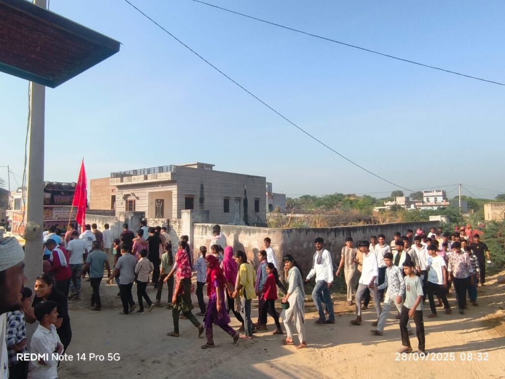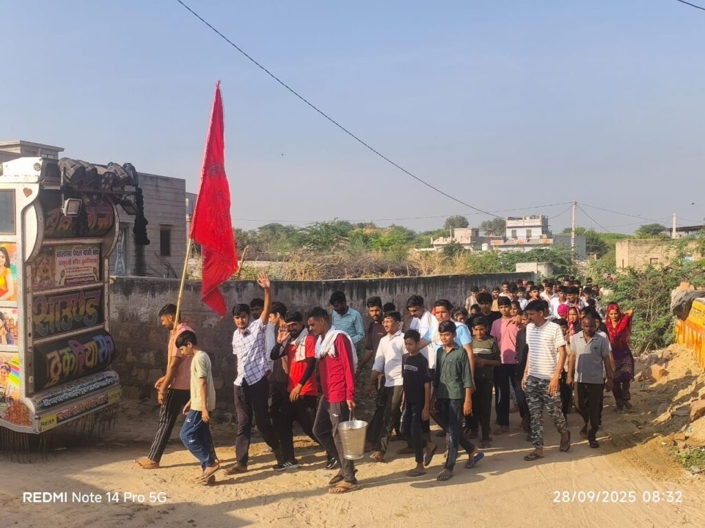 NEXT 28 सितम्बर, 2025 श्रीडूंगरगढ़। रविवार सुबह गांव सातलेरा भक्ति और आस्था के रंग में रंगा नजर आया। डीजे पर बजते भक्ति गीत “लागे तावड़ो सालासर के मेला में, मेरी मां बाबे ने कह दे ताण छतरी”, हाथों में लाल ध्वज, पैरों में बंधे घुंघरू और जय बजरंगबली के नारों के बीच जब श्रद्धालु नाचते-गाते निकले तो पूरा गांव भक्तिमय माहौल में डूब गया।
