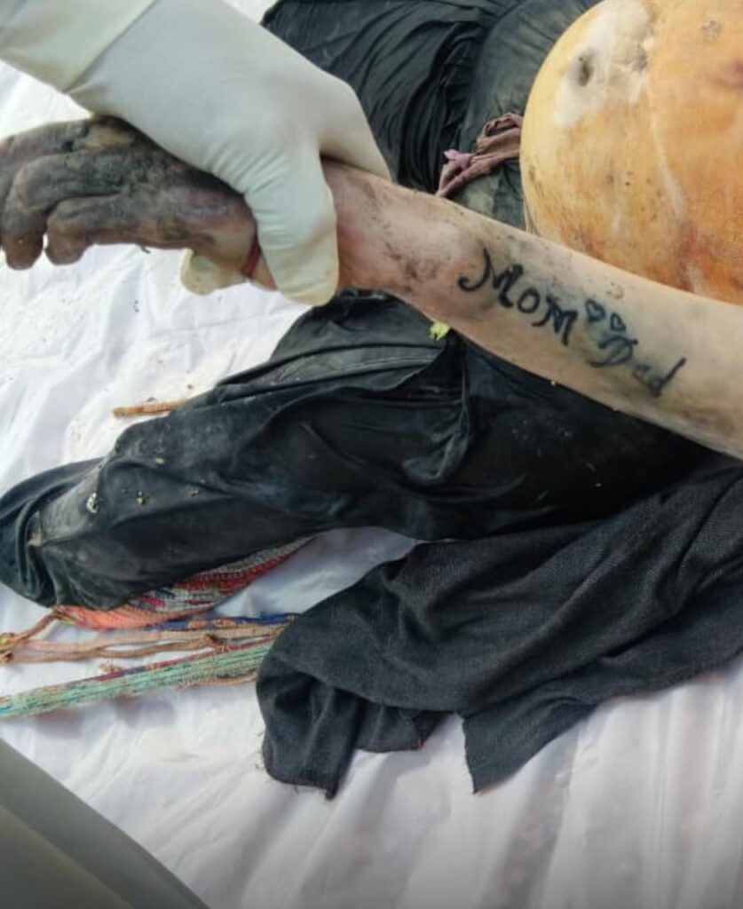 मृतका ने काले रंग का पायजामा, ऊपर कुर्ता और गर्म कोट पहन रखा था। कुर्ते पर सफेद रंग की कढ़ाई/छाप है, जबकि कोट एक तरफ मेहंदी रंग और दूसरी तरफ काले रंग का है। गले में काले धागे के साथ पीले रंग की आर्टिफिशियल चैन और दोनों कानों में सफेद रंग के टॉप्स मिले हैं। महिला के बाएं हाथ पर नीले रंग में अंग्रेजी में “Mom, Dad” गुदा हुआ है।