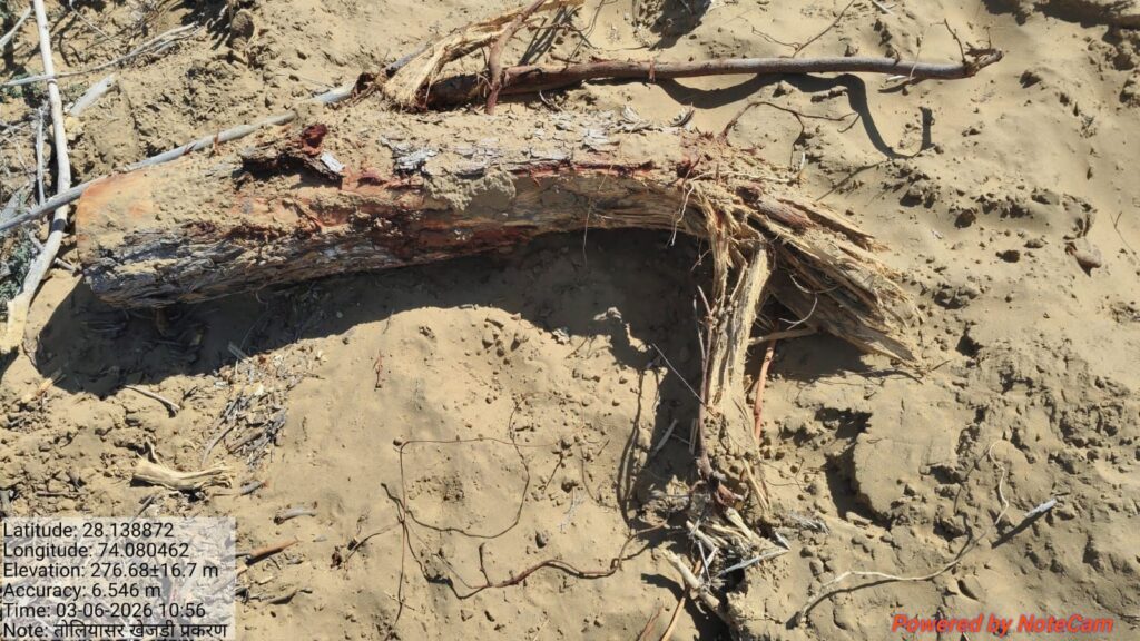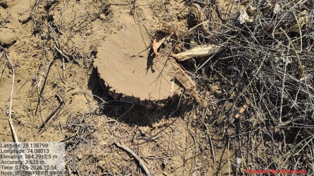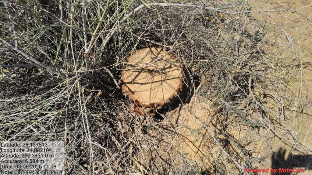 उन्होंने बताया कि खसरा नम्बर 505 राजस्व रिकॉर्ड में गैर मुमकिन कुआं के नाम से दर्ज है, जबकि खसरा नम्बर 506 खातेदारी भूमि के रूप में दर्ज है। इन दोनों खसरों पर विलायती बबूल और खेजड़ी के पेड़ों का कटान पाया गया।