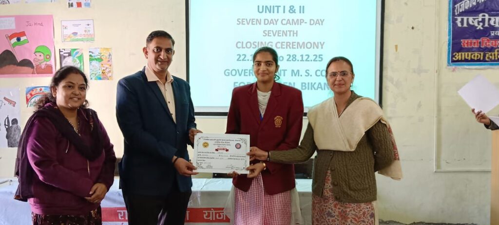 NEXT 28 दिसम्बर, 2025 श्रीडूंगरगढ़। राजकीय महारानी सुदर्शन कन्या महाविद्यालय में राष्ट्रीय सेवा योजना (एनएसएस) इकाई प्रथम एवं द्वितीय के संयुक्त तत्वावधान में आयोजित सात दिवसीय विशेष शिविर का रविवार को समापन हुआ। कार्यक्रम महाविद्यालय के प्राचार्य प्रो. नवदीप सिंह बैंस एवं वरिष्ठ संकाय सदस्य प्रो. मंजू मीणा के मार्गदर्शन में आयोजित किया गया।