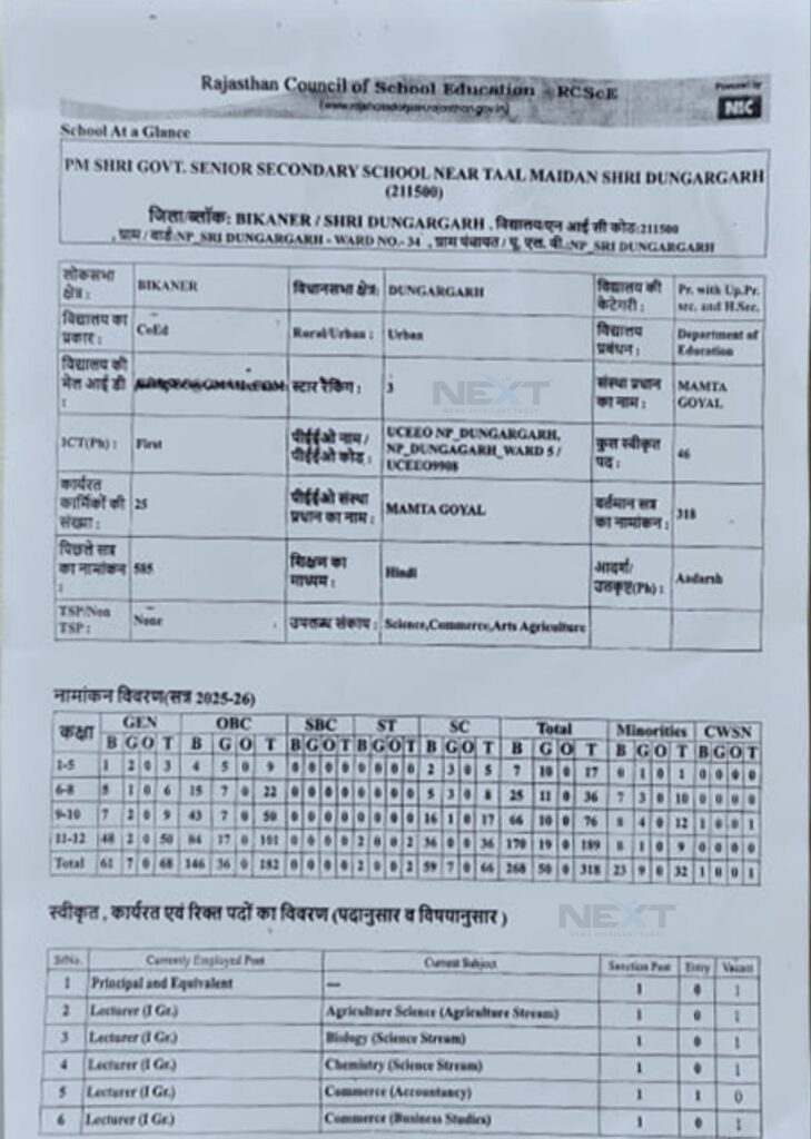NEXT 11 दिसम्बर, 2025 श्रीडूंगरगढ़। प्रदेश की शिक्षा व्यवस्था पर गंभीर सवाल उठाने वाला मामला सामने आया है। राज्य में 230 सरकारी स्कूल ऐसे हैं, जहां एक भी विद्यार्थी नहीं है, लेकिन वहाँ 310 शिक्षक रोजाना हाजिरी लगाकर वेतन ले रहे हैं। वहीं श्रीडूंगरगढ़ के सबसे बड़े सरकारी विद्यालय PM SHRI राजकीय उच्च माध्यमिक विद्यालय में 318 विद्यार्थी तो हैं, पर उन्हें पढ़ाने के लिए पर्याप्त शिक्षक नहीं। दोनों स्थितियाँ मिलकर सरकार की शिक्षा नीति और तंत्र पर बड़ा प्रश्नचिह्न छोड़ती हैं।
