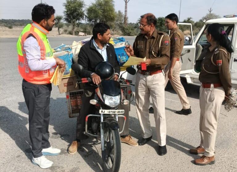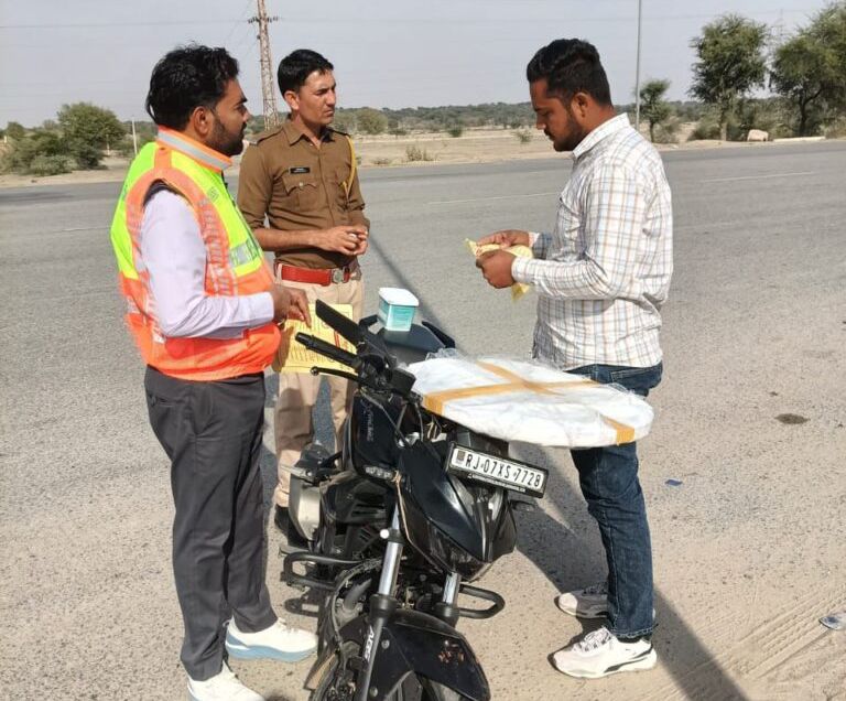 NEXT 18 जनवरी, 2026 श्रीडूंगरगढ़। सीकर- बीकानेर हाईवे स्थित लखासर टोल प्लाजा पर सड़क सुरक्षा माह के तहत जागरूकता अभियान चलाया गया। हाईवे पुलिस टीम और लखासर टोल टीम ने संयुक्त रूप से हाईवे से गुजरने वाले वाहनों को रिफ्लेक्टिव स्टिकर और टेम्प्लेट वितरित किए।