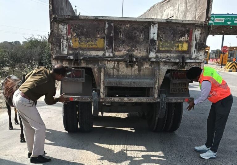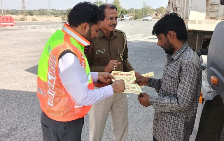 टोल टीम और हाईवे पुलिस ने बांटे रिफ्लेक्टिव स्टिकर, ड्राइवरों को बताए ट्रैफिक नियम