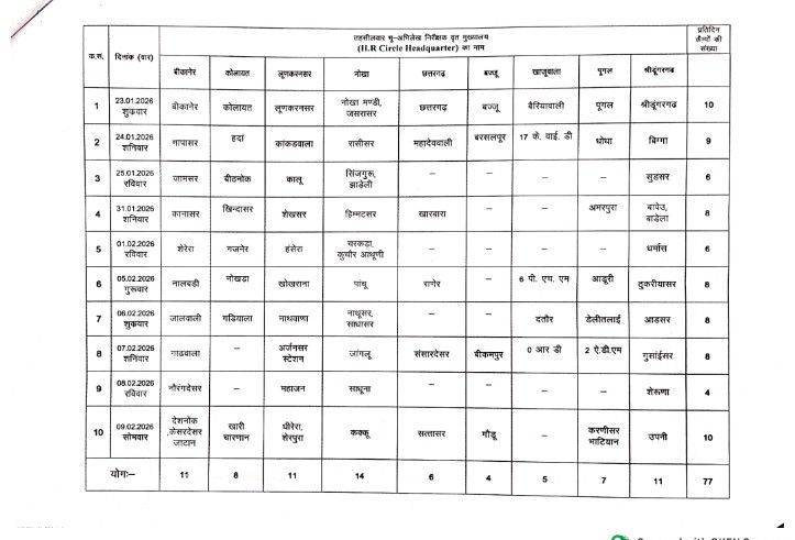 NEXT 22 जनवरी, 2026 श्रीडूंगरगढ़। भू-अभिलेख निरीक्षक वृत्त मुख्यालय पर 23 जनवरी से 9 फरवरी 2026 तक ग्राम उत्थान विशेष शिविर आयोजित किए जाएंगे। इसी क्रम में भू-अभिलेख वृत्त श्रीडूंगरगढ़ का शिविर कल 23 जनवरी को पंचायत समिति, श्रीडूंगरगढ़ में लगेगा।