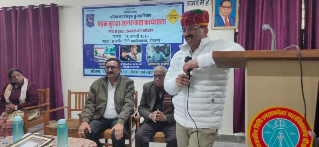 NEXT 13 जनवरी, 2026 श्रीडूंगरगढ़। राजकीय विधि स्नातकोत्तर महाविद्यालय बीकानेर में राष्ट्रीय सड़क सुरक्षा माह के तहत सड़क सुरक्षा एवं यातायात नियमों को लेकर जागरूकता कार्यशाला आयोजित की गई। आयोजन परिवहन एवं सड़क सुरक्षा विभाग और महाविद्यालय के संयुक्त तत्वावधान में हुआ। कार्यक्रम में विद्यार्थियों को सड़क सुरक्षा के प्रति जागरूक किया गया और यातायात नियमों के पालन की शपथ दिलाई गई।